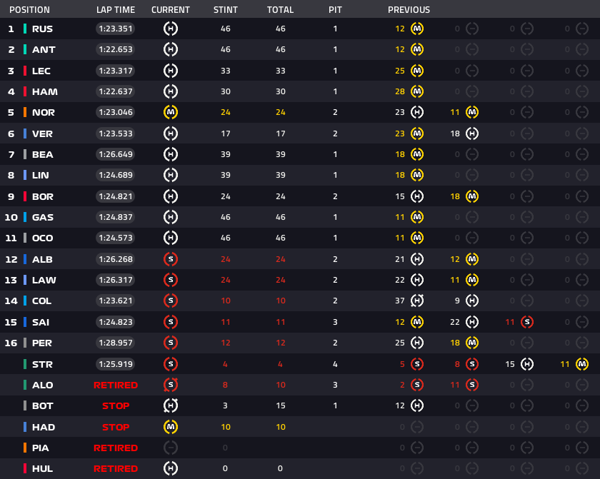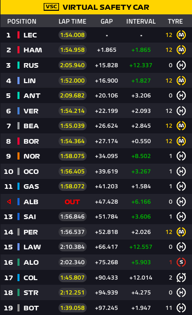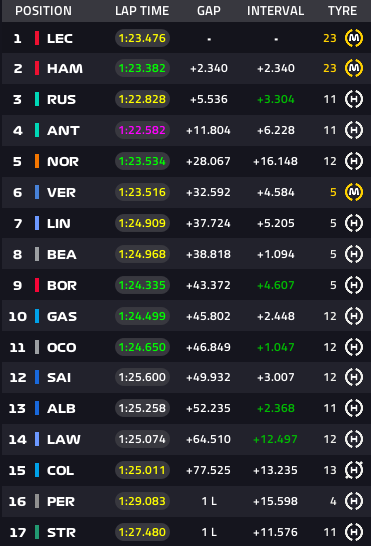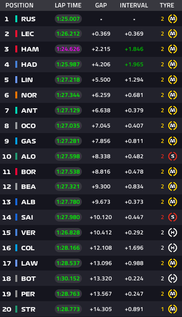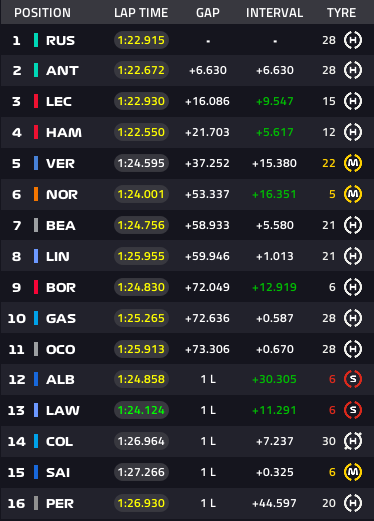 Lap4:ルクレール、ラッセル、ハミルトンのトップ3です。