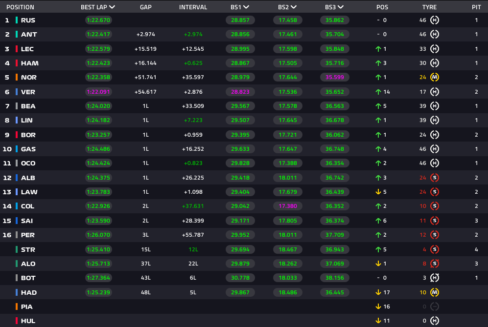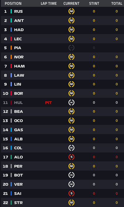 スタート: ルクレールがターン2でトップへ、ラッセルが続く、ハジャーはリンドブラッドに抜かれる。