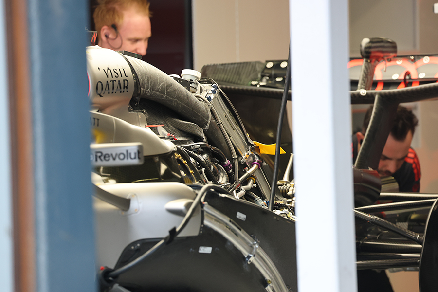 今年からはエンジン上部インダクションポッドに厚めの直方体型空冷ユニットを設置しています。