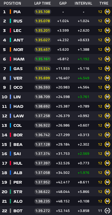 Lap36:ピアストリとハミルトンの差は1秒以上になり、ラッセルが迫る。