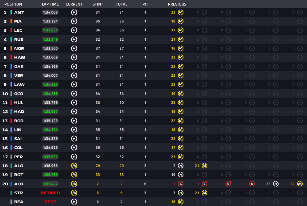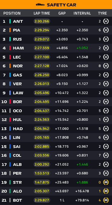 アントネッリはピットロスタイム10秒でトップへ、ここでほぼ全員がピットストップ完了です。