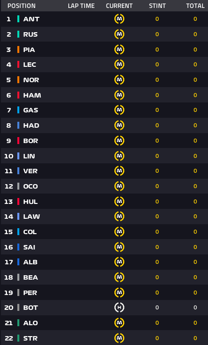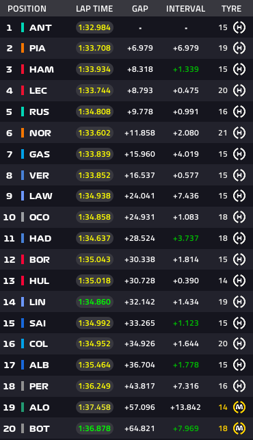 Lap53終了:アントネッリがトップチェッカー、ピアストリが2位、ルクレールが3位守る。