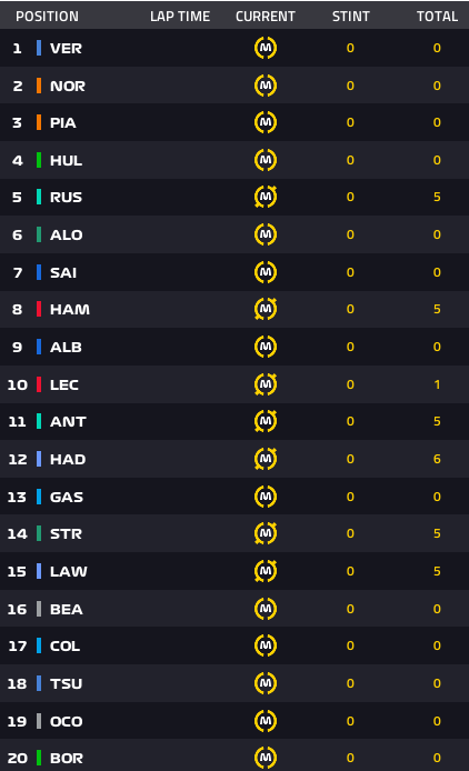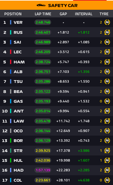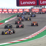 スタート:フェルスタッペンがホールショット、ヒュルケンベルグとアロンソが接触、アロンソがピアストリへ接触、ピアストリがノリスへ接触、SCです。