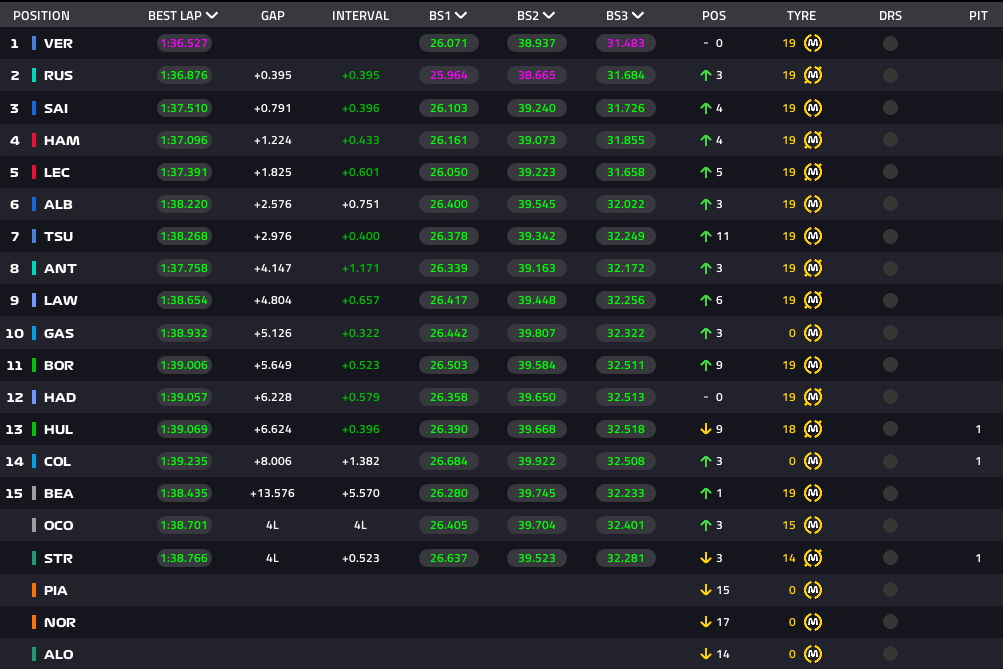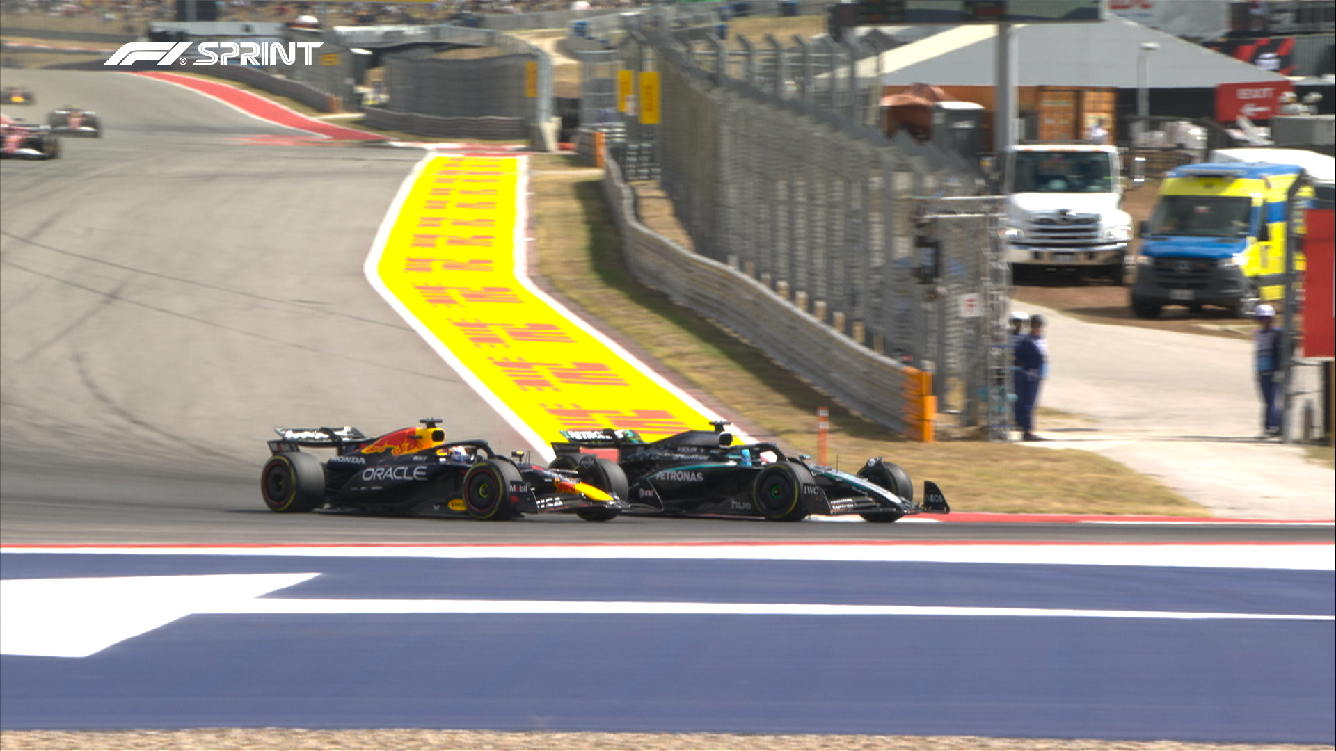 Lap8:ラッセルはターン12でフェルスタッペンのインに突っ込み並んで2台ともコースアウトで逃げる。