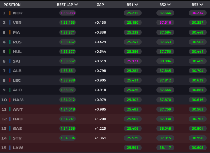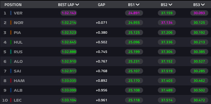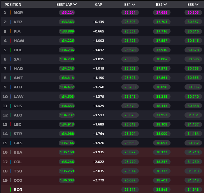 ノリス33.2でトップ更新、フェルスタッペン33.3、ピアストリ33.8のトップ3