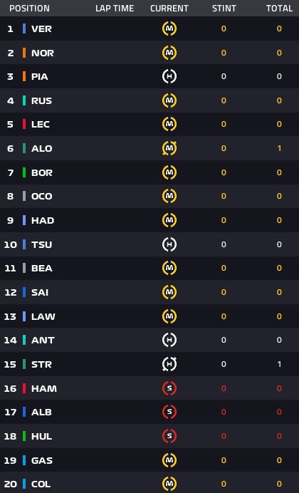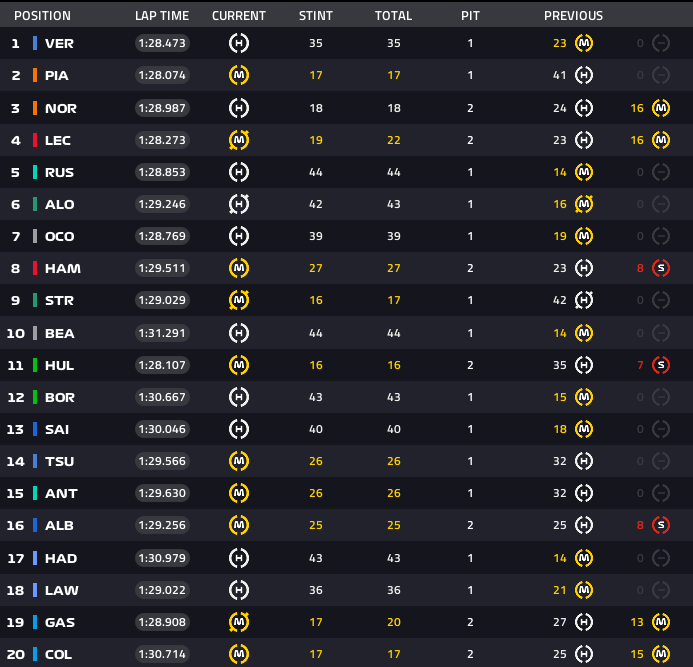 Lap20:オコンはハードへ17位、ルクレールは2台抜きで5位へ