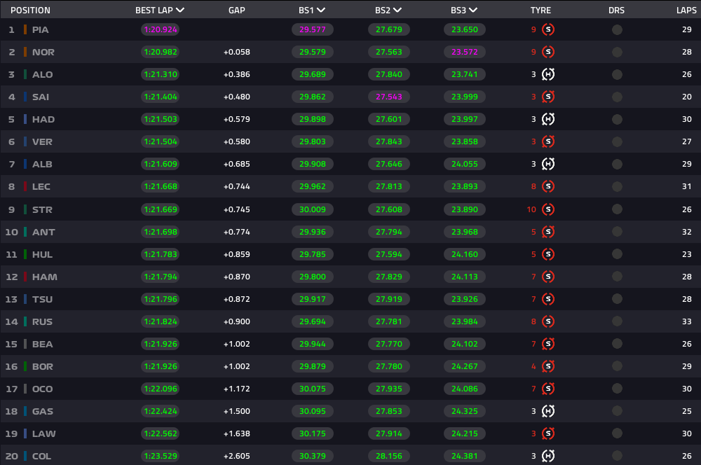 各車ハードで走り出す、ウィングの感じからもダウンフォース多めのフェルスタッペンが速い。