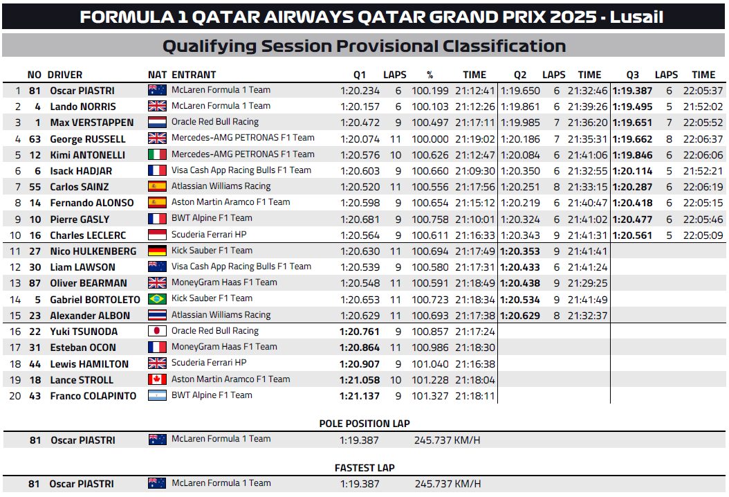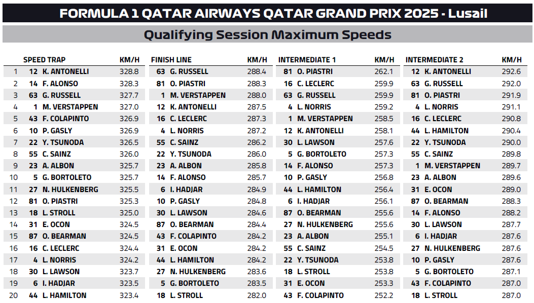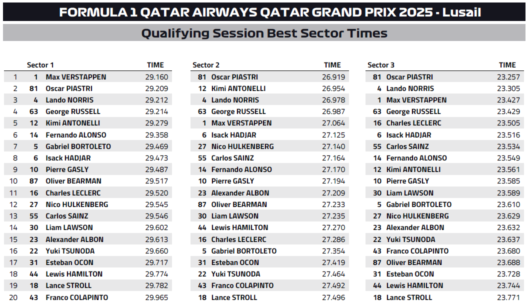 2025年F1第23戦カタールGP予選データ(スピードトラップ・セクタータイムetc) 2025-11-30 4PVコメント(0) 2025年F1第23戦カタールGP予選は、ピアストリがポールポジション、2番手ノリス、3番手フェルスタッペンになっています。チャンピオン争いの3人が上位を独占しています。 Sponsored link カタールGP予選結果 スピードトラップ&ベストセクタースピード ベストセクタータイム タイヤ関連情報 「2025年F1第23戦カタールGP予選結果」 関連記事はこちら 2025年F1第15戦オランダGP予選データ(スピードトラップ・セクタータイムetc) 2025年F1第9戦スペインGP予選データ(スピードトラップ・セクタータイムetc) 2025年F1第7戦エミリアロマーニャGP予選データ(スピードトラップ・セクタータイムetc) 2025年F1第4戦バーレーンGP予選データ(スピードトラップ・セクタータイムetc) コメントをどうぞ 返信をキャンセルする。 ニックネーム メールアドレス(必須ではありません,入力頂くと次回より承認なしにコメントできます,公開されません) コメント送信 Δ