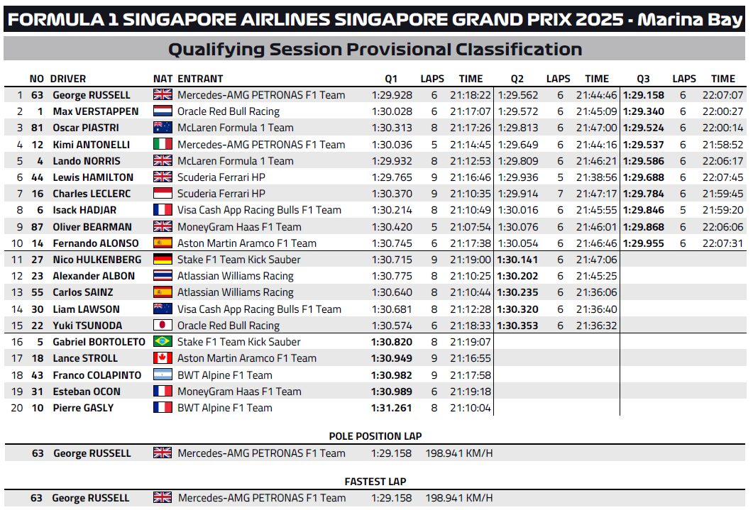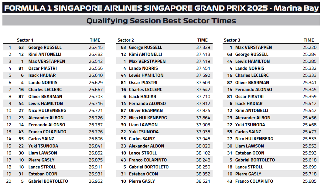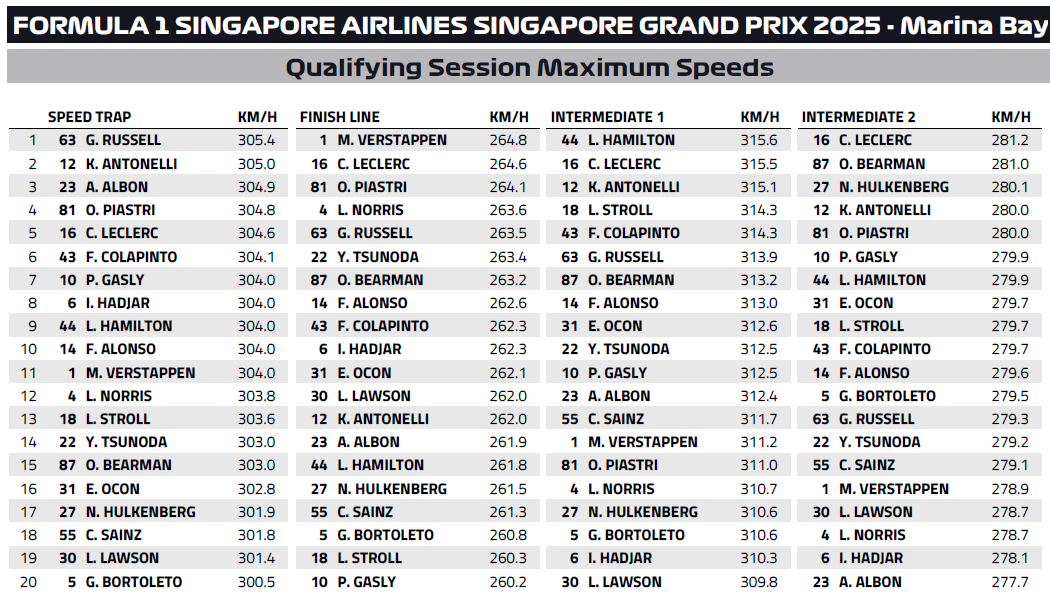 2025年F1第18戦シンガポールGP予選データ(スピードトラップ・セクタータイムetc) 2025-10-05 14PVコメント(0) 2025年F1第18戦シンガポールGP予選は、FP3から速さがあったメルセデスのラッセルがポールポジション、フェルスタッペンは2番手、ピアストリが3番手でした。 Sponsored link シンガポールGP予選結果 スピードトラップ&ベストセクタースピード ベストセクタータイム タイヤ関連情報 「2025年F1第18戦シンガポールGP予選結果「伏兵の矢!」」 関連記事はこちら 2025年F1第16戦イタリアGP予選データ(スピードトラップ・セクタータイムetc) 2025年F1第8戦モナコGP予選データ(スピードトラップ・セクタータイムetc) 2024年F1第18戦シンガポールGP予選データ(スピードトラップ・セクタータイムetc) 2023年F1第16戦シンガポールGP予選データ(スピードトラップ・セクタータイムetc) コメントをどうぞ 返信をキャンセルする。 ニックネーム メールアドレス(必須ではありません,入力頂くと次回より承認なしにコメントできます,公開されません) コメント送信 Δ