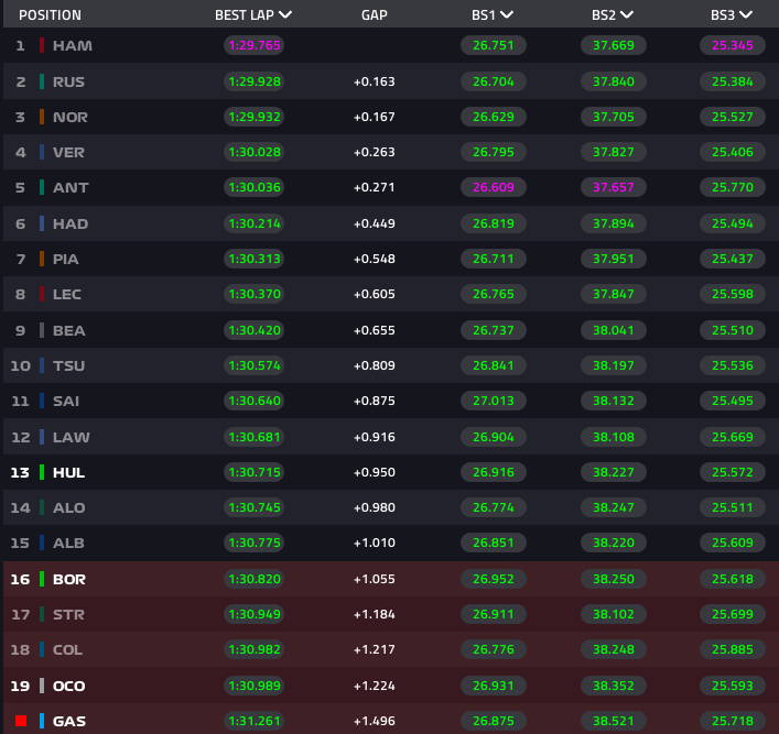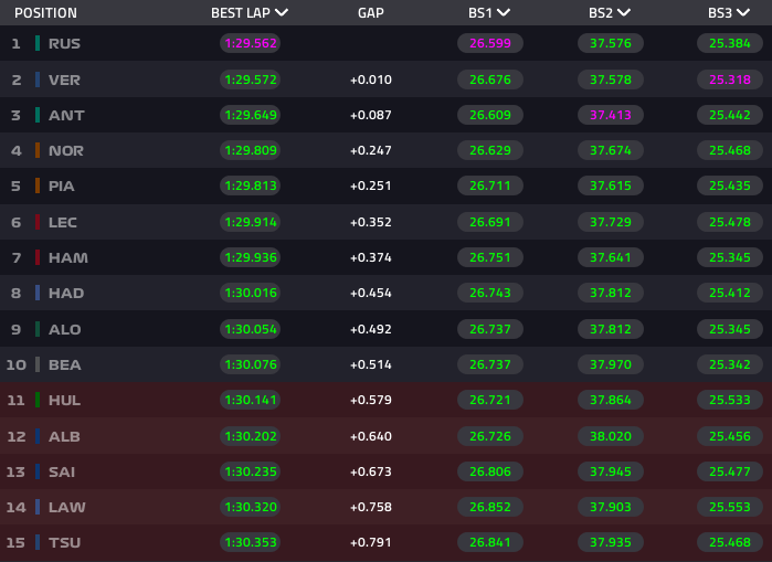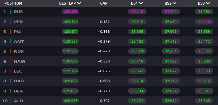 ラッセル29.562でトップ更新、フェルスタッペン29.5、アントネッリ29.6