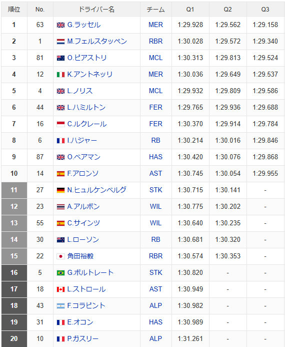 ピアストリ29.8、ハミルトン29.9、ノリス30.0、ハジャー30.1、アロンソ30.1