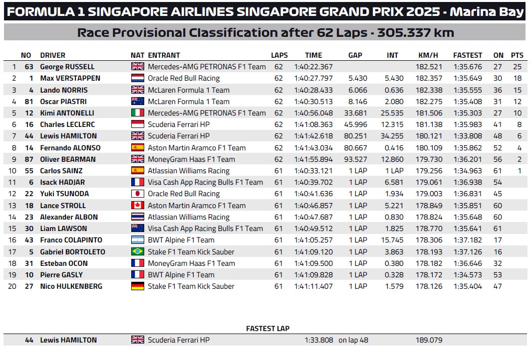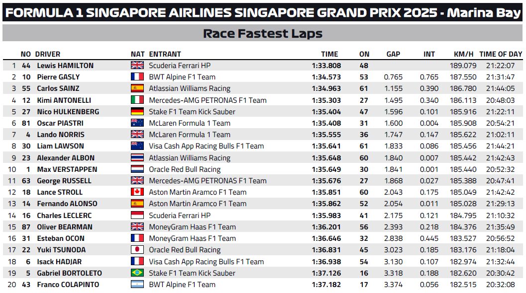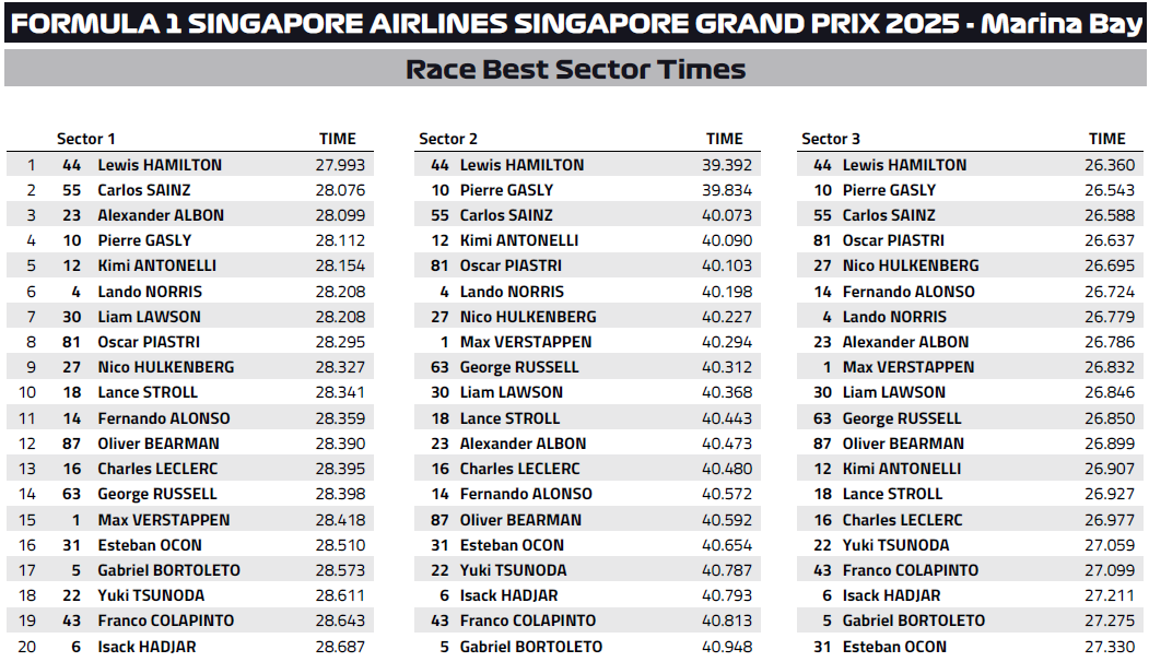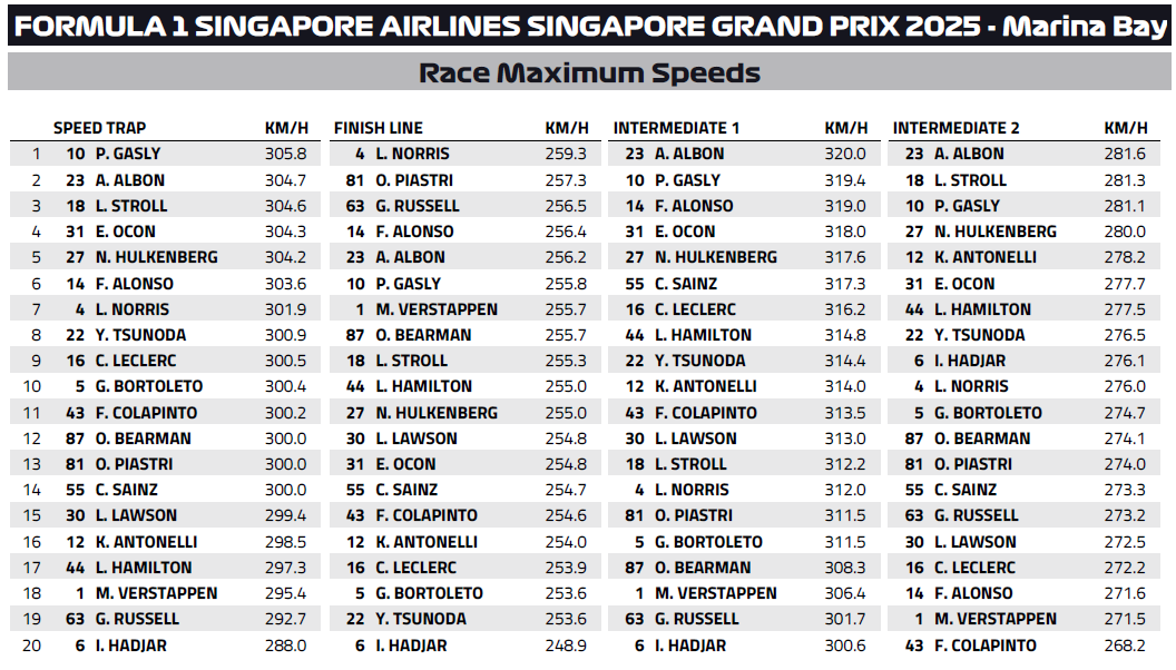2025年F1第18戦シンガポールGP決勝データ(スピードトラップ・セクタータイム・ファーステストタイム) 2025-10-07 199PVコメント(0) 2025年F1第18戦シンガポールGP決勝は、ラッセルがポールトゥウィンで今季2勝目、フェルスタッペンは2位でした。ノリスが3位、ピアストリが4位、マクラーレンはコンストラクターズチャンピオンを決めました。 Sponsored link シンガポールGP決勝結果 決勝タイヤ交換状況 スピードトラップ&ベストセクタースピード ベストセクタータイム ファーステストタイム 「2025年F1第18戦シンガポールGP決勝結果」 関連記事はこちら 2025年F1第13戦ベルギーGP決勝データ(スピードトラップ・セクタータイム・ファーステストタイム) 2025年F1第8戦モナコGP決勝データ(スピードトラップ・セクタータイム・ファーステストタイム) 2024年F1第18戦シンガポールGP決勝データ(スピードトラップ・セクタータイム・ファーステストタイム) 2023年F1第16戦シンガポールGP決勝データ(スピードトラップ・セクタータイム・ファーステストタイム) コメントをどうぞ 返信をキャンセルする。 ニックネーム メールアドレス(必須ではありません,入力頂くと次回より承認なしにコメントできます,公開されません) コメント送信 Δ