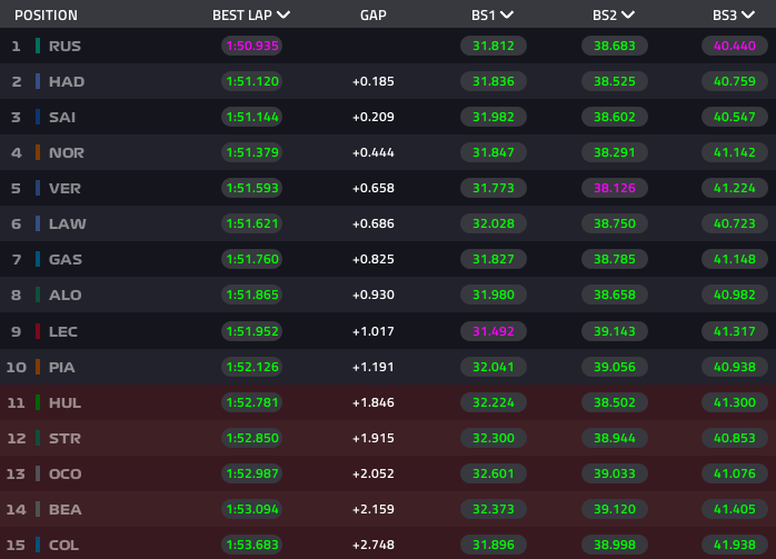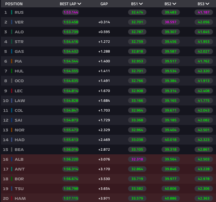 サインツ48.296、フェルスタッペン48.257、ラッセル48.8