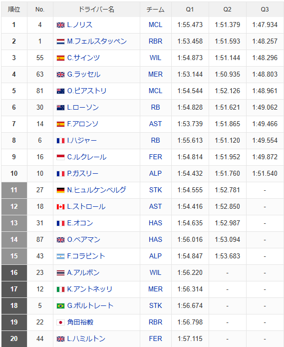 ピアストリ49.1、サインツ49.2、ノリス49.6、ローソン50.1、フェルスタッペン51.1