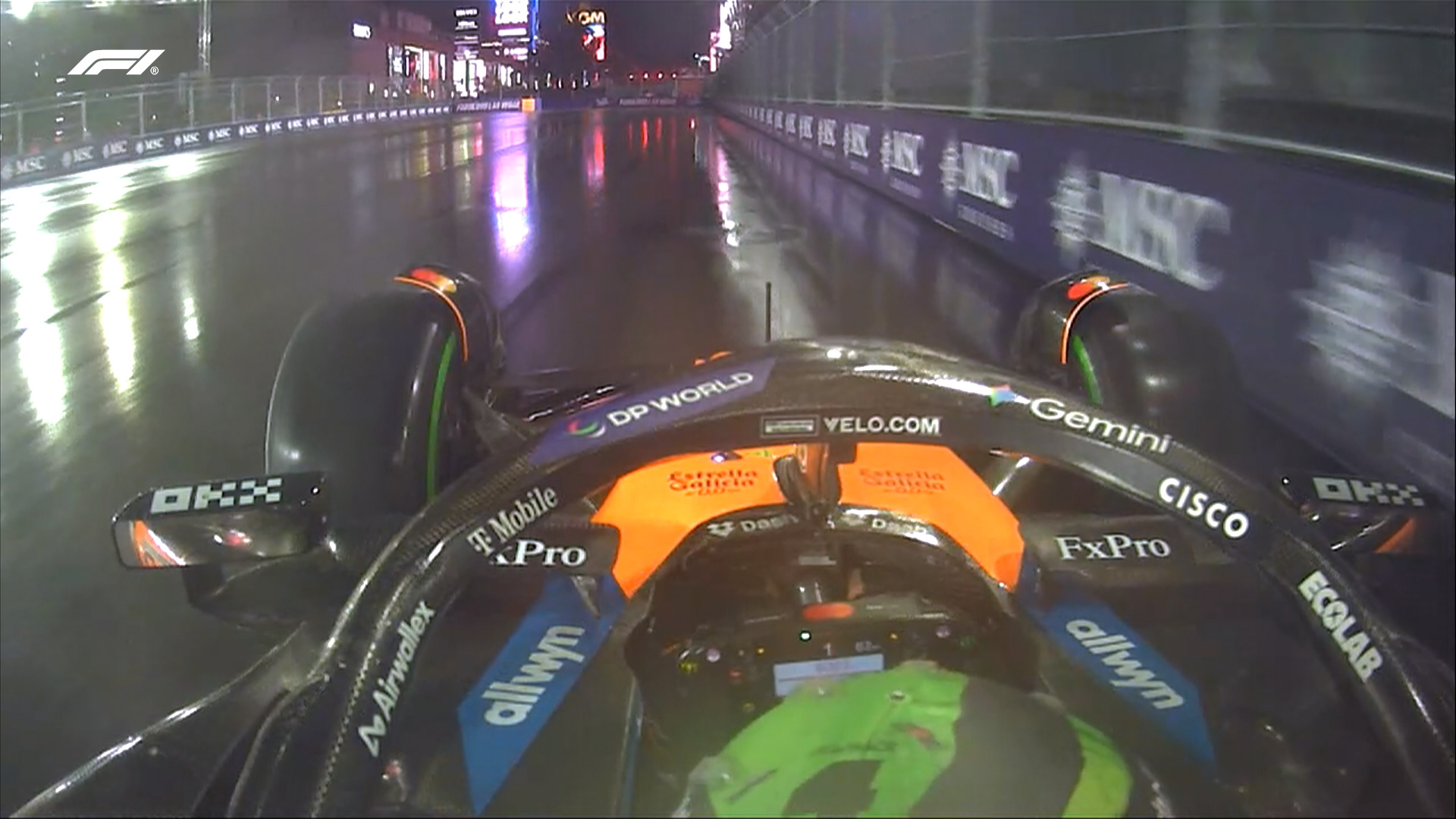 雨の予選となったラスベガス、ノリスは一人飛びぬけたタイムでポールポジションです。