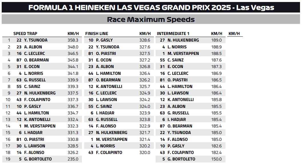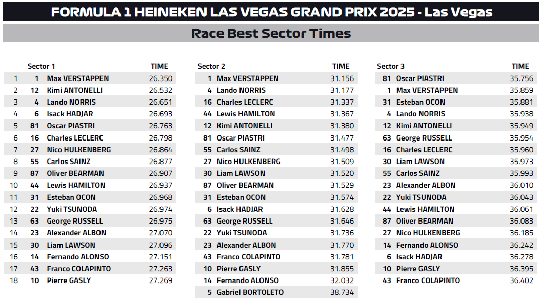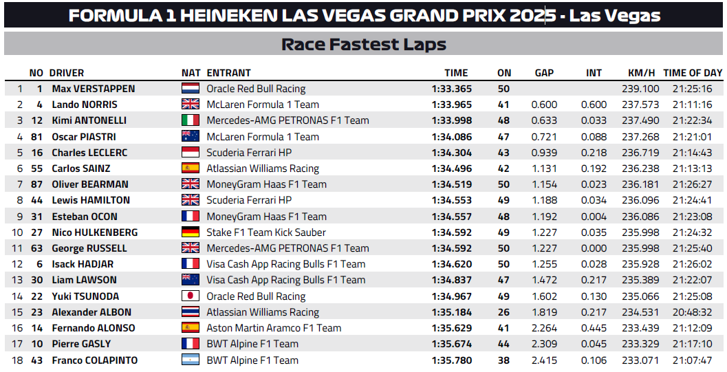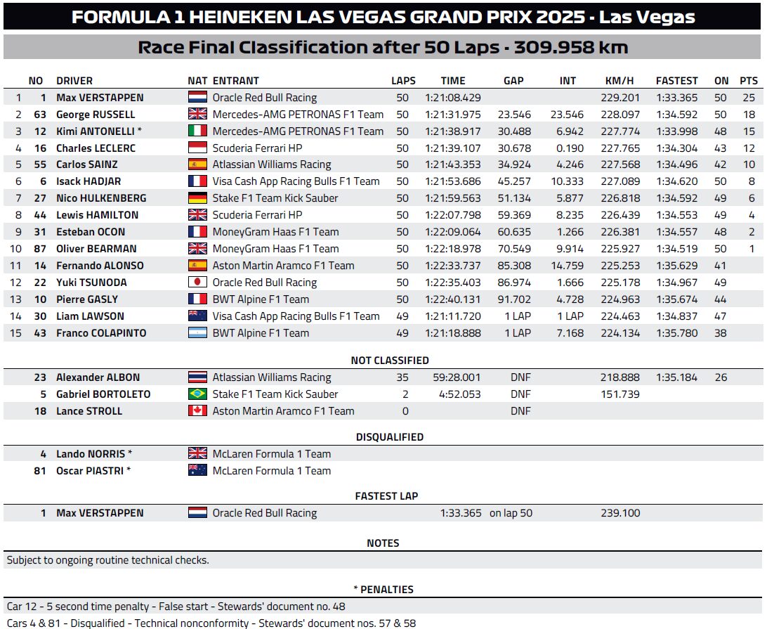 2025年F1第22戦ラスベガスGP決勝は、フェルスタッペンがターン1でトップに立ち優勝、2位ノリスと4位ピアストリは失格、繰上りで2位ラッセル、3位アントネッリになっています。